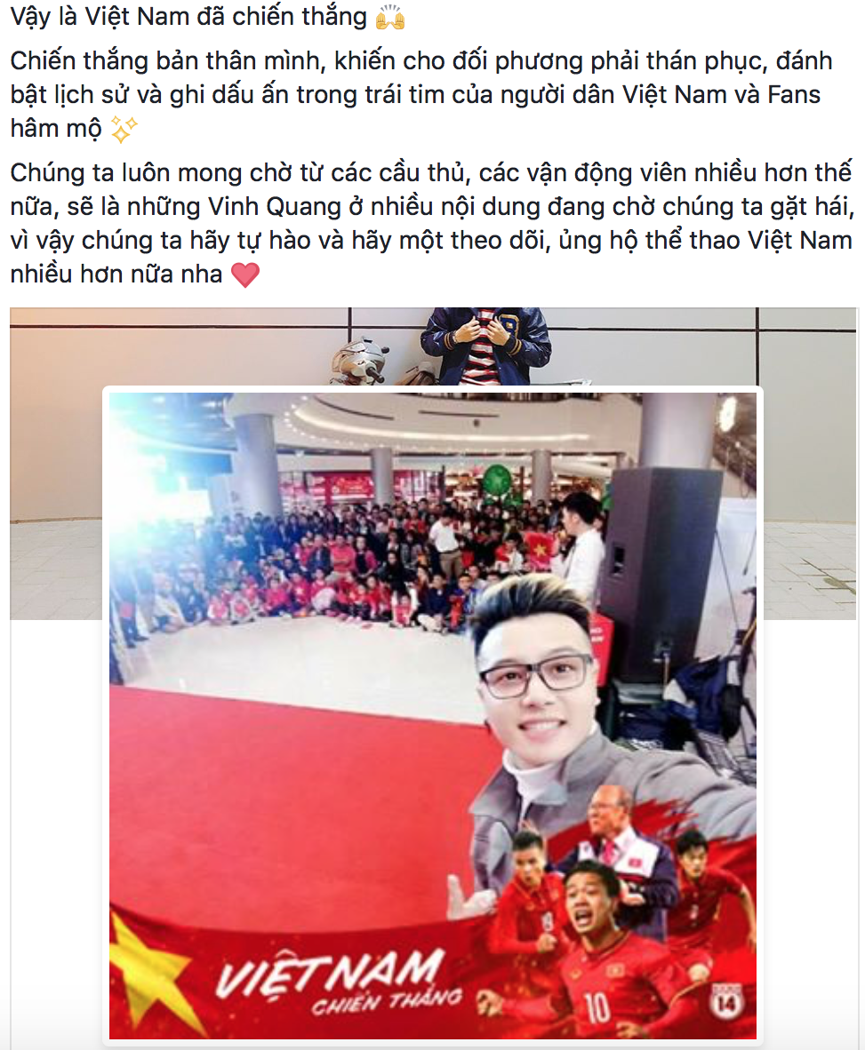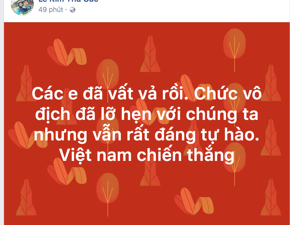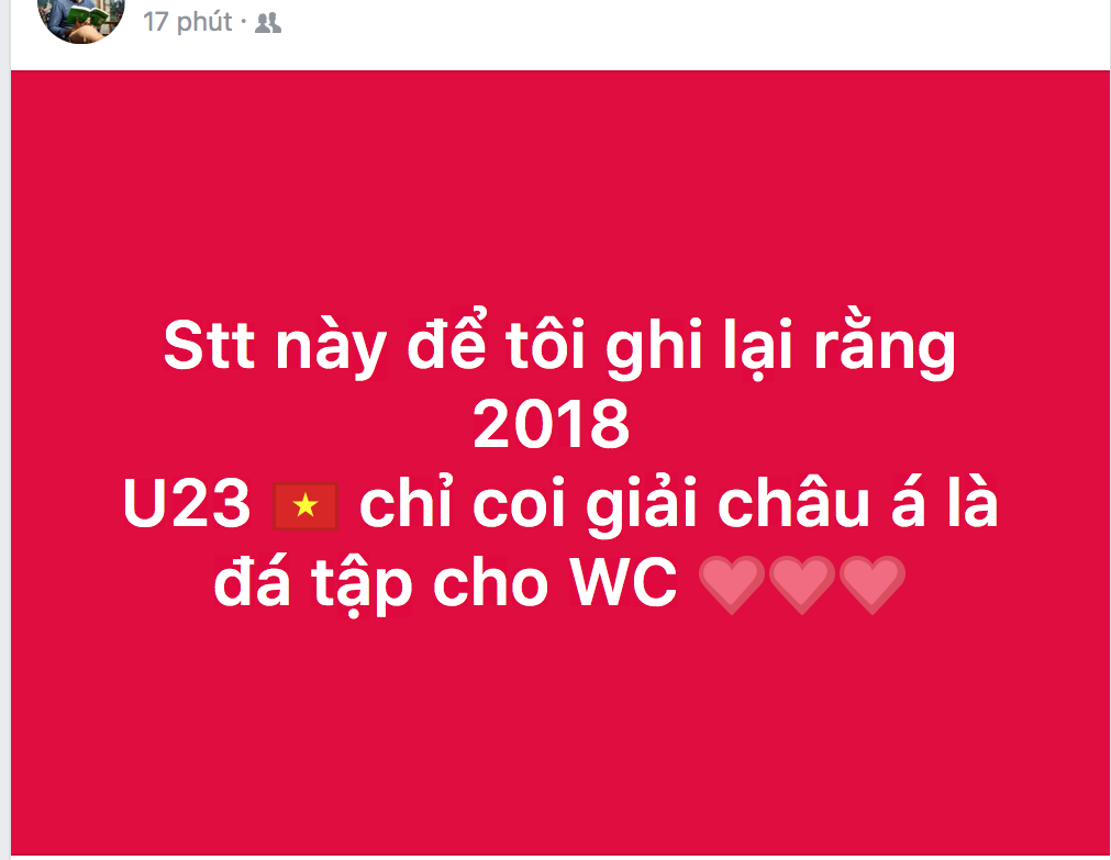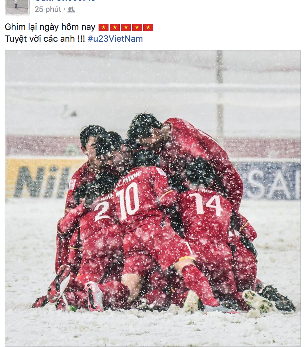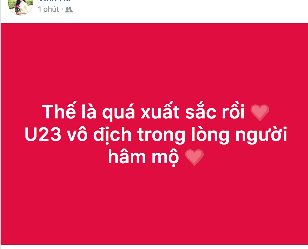 Nhưng ở một diễn biến khác, bất chợt cả Facebook đều được nhuộm đỏ với những lời an ủi, động viên và tự hào dành cho U23 Việt Nam - vì một giải đấu xuất sắc, hết mình và văn minh. Có thể nói, dù thua U23 Uzbekistan, nhưng U23 Việt Nam đã chiến thắng trong lòng người hâm mộ. Nhìn lại cả trận đấu hôm nay, các chàng trai đã chiến đấu cực kỳ ngoan cường đến sức tàn lực kiệt, giữa thời tiết khắc nghiệt và bất lợi về thể chất. Họ đã chiến đấu đến giờ phút cuối cùng, với sự xuất sắc của từng cá nhân cũng như tinh thần đoàn kết hiếm có.