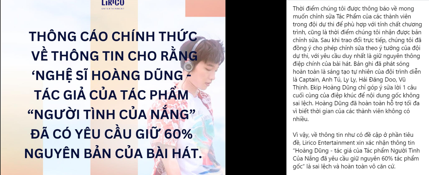 | Đại diện ca sĩ Hoàng Dũng thông tin về vấn đề đang gây tranh cãi, phủ nhận Hoàng Dũng việc "yêu cầu giữ 60% nguyên bản bài hát Người Tình Của Nắng". |