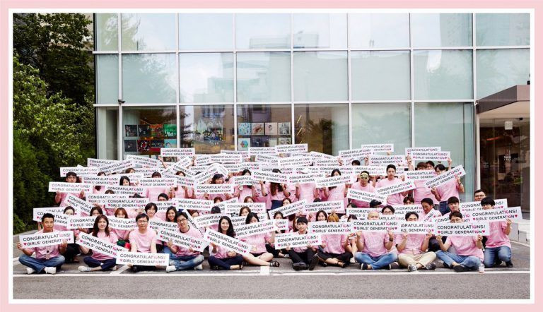 Các nhân viên công ty SM Ent đã cùng nhau mặc áo hồng - màu đại diện của SNSD để cùng chụp một tấm ảnh thay lời chúc mừng sinh nhật đển các cô gái mà họ yêu mến.