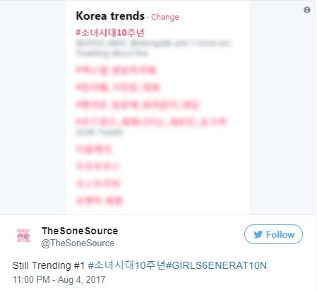 Cụm từ #소녀시대10주년 (SNSD 10 năm debut) hiện đang đứng đầu trang tìm kiếm cũng như mạng xã hội Hàn Quốc.