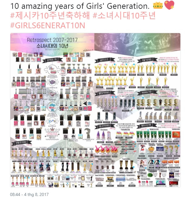 Hay kỳ công hơn, các fan còn tổng hợp lại các giải thường mà SNSD đã giành được suốt 10 năm qua. Ảnh: ㅅ @yulneck.