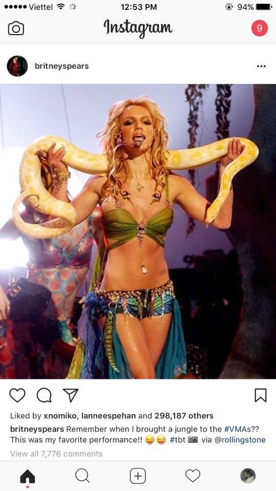 Trong một diễn biến không liên quan khác, Britney Spears bất ngờ vừa đăng tải tấm ảnh cõng trăn thần thánh tại VMAs năm nào. Nhiều fan US&UK thích thú cho rằng Britney hẳn cũng đang nghe ca khúc mới của Taylor và âm thầm tỏ ý ủng hộ chăng?