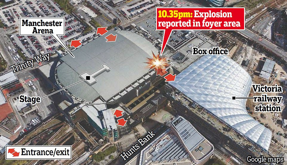 Theo tờ The Guardian: Cảnh sát và xe cứu thương ngay lập tức được điều động đến hiện trường. Ga tàu điện Manchester Victoria, gần sân vận động Manchester, tạm thời bị đóng cửa. Cảnh sát yêu cầu người dân tránh xa khu vực xảy ra vụ nổ. Một quả bom khác chưa kịp phát nổ đã được cảnh sát tìm thấy ở hiện trường. Cảnh sát đã khống chế quả bom và cho nổ tại vườn hoa gần đó.