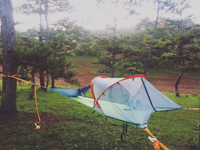 Nếu thường xuyên xem những bộ phim của Mỹ, chắc bạn cũng đã một lần GATO với trẻ con ở đó khi được bố mẹ tặng hẳn cho một ngôi nhà ở trên cây. Với dịch vụ khách sạn “ngàn sao” - ngủ lều treo lơ lửng trên cây, chiếc lều truyền thống nhưng thay vì được cắm xuống đất sẽ buộc ở lưng chừng các thân cây to, tụi mình sẽ cảm thấy như đang bay lơ lửng hệt Cô Long trong phim Thần điêu đại hiệp. Bạn Thái Mỹ chia sẻ: “Nhìn “mái nhà nhỏ” - cái lều ấy, được mọc lên giữa bao la bạt ngàn thăm thẳm cây và hoa thích lắm. Cảm tưởng như cả thiên nhiên chỉ còn tớ và lũ bạn vậy, cả thế giới xanh thuộc về tụi mình hết nên tha hồ mà “bung xoã” mà không sợ… hàng xóm la”. Những khu vực “dựng trại bay” đều được kiểm tra an ninh chặt chẽ và luôn có đội quản lý nên rất an toàn. Nếu bạn thích phượt, chuẩn bị sẵn sàng tâm lý… đối đầu mọi loại muỗi và côn trùng và muốn hòa mình với thiên nhiên thì đây là một lựa chọn không tồi chút nào!