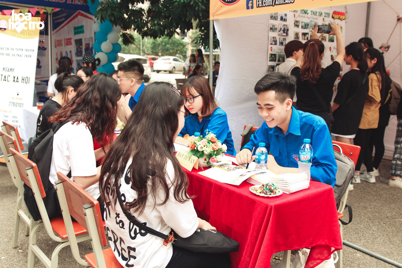 Tham gia ngày hội, các bạn học sinh còn được giao lưu, tìm hiểu kỹ hơn về các ngành học thông qua tư vấn của các thầy cô giáo và các anh chị tại các gian trại tư vấn tuyển sinh từ các khoa.