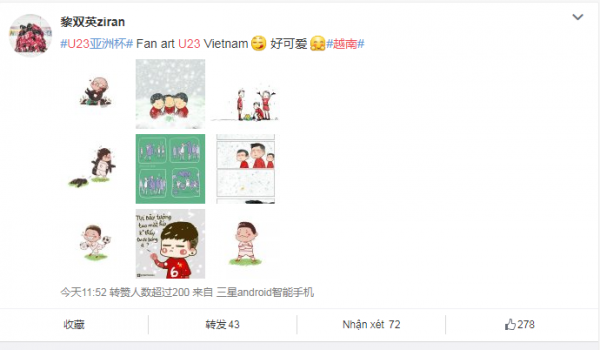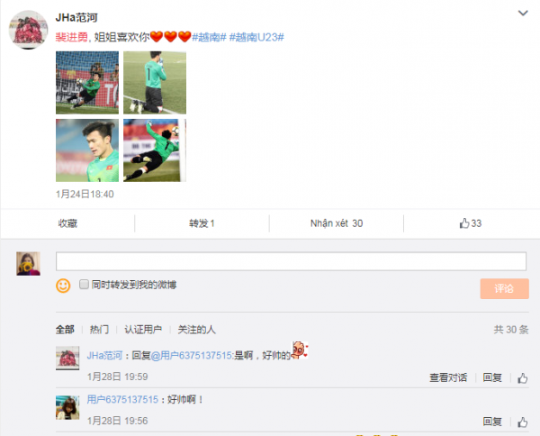 Thời gian gần đây, hình ảnh các cầu thủ U23 Việt Nam xuất hiện dày đặc trên trang mạng xã hội lớn nhất tại Trung Quốc Weibo. Rất nhiều người hâm mộ, đặc biệt là các fan nữ, đã dành những tình cảm yêu mến đặc biệt cho các cầu thủ trẻ. Và người được các chị em “săn lùng” nhiều nhất không ai khác chính là thủ môn Bùi Tiến Dũng.