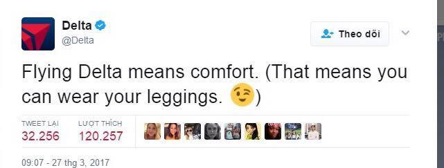 Còn hãng Delta Airlines - đối thủ của United Airlines đang cố gắng vực dậy trở lại qua các sự cố gần đây và đây là cách họ khắc phục mọi sự tức giận của khách hàng: "Bay cùng Delta có nghĩa là thoải mái. Điều đó có nghĩa bạn có thể mặc quần legging lên máy bay" (ám chỉ vụ United cấm hành khách mặc kiểu quần này lên máy bay gây bức xúc thời gian gần đây).
