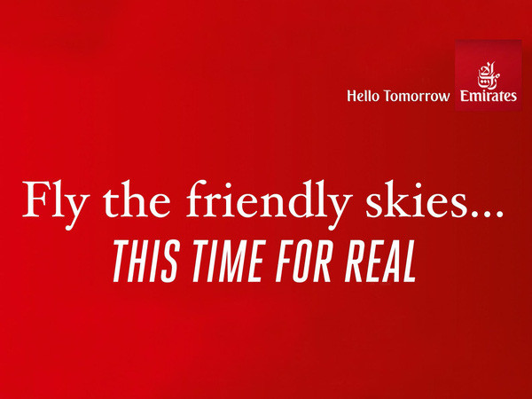 Để mỉa mai United, hãng Emirates đã nhại lại câu slogan của hãng hàng không Mỹ: "Fly the friendly skies" (tạm dịch: Bay trên những bầu trời thân thiện) nhưng kèm theo đó là câu “This time for real” (lần này là thật).