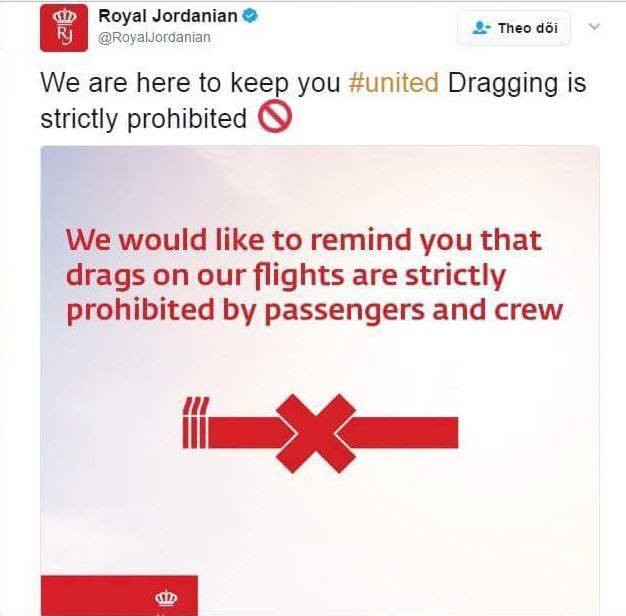Còn hãng hàng không Royal Jordanian lại chọn cách chế nhạo nhẹ nhàng hơn với thông điệp đa nghĩa “We are here to keep you #united” và nhấn mạnh rằng “nghiêm cấm việc kéo trên các chuyến bay”. Nó giống như một thông báo cấm hút thuốc nhưng hầu hết những người dùng mạng Twitter đều hiểu “kéo” theo cách mà hãng này đề cập đến.