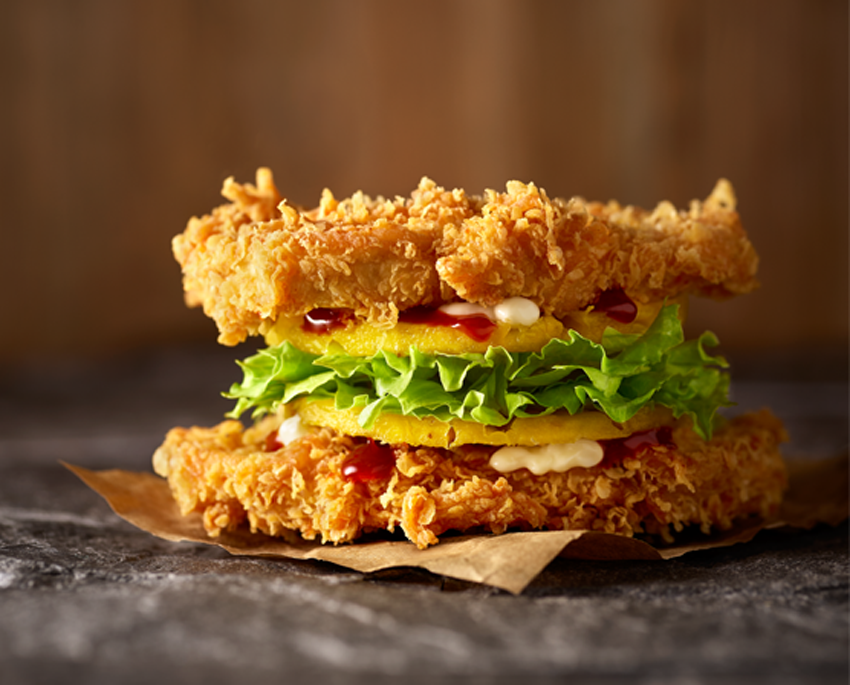 Đây là món ăn dành cho các tín đồ lowcarb. Nếu như trước đây các lowcarb-er làm bánh burger sẽ dùng súp lơ để làm thành vỏ bánh, thì nay đã có một nguyên liệu thay thế chất lừ - đó chính là gà. Gà được băm nhuyễn rồi nặn thành miếng, kẹp với salad để làm cân bằng hương vị, bao gồm rau xà-lách tươi và lát dứa ngọt thanh, cuối cùng phủ thêm 2 lớp sốt Mayonnaise thơm béo và sốt.