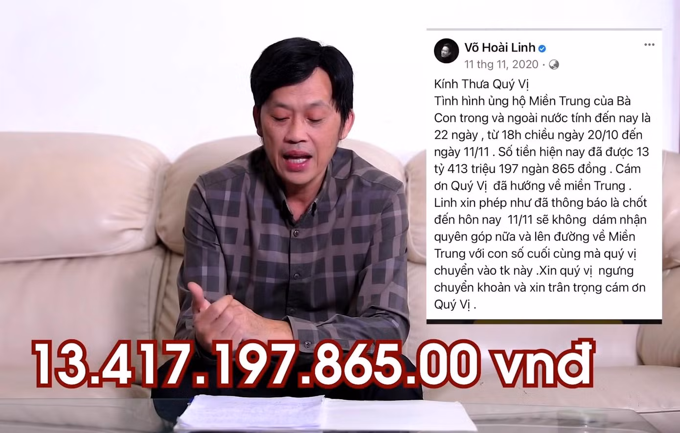 Tối ngày 24/5, nghệ sĩ Hoài Linh đã chính thức lên tiếng về số tiền từ thiện mà khán giả cùng nhiều nhà hảo tâm đóng góp giúp đồng bào lũ lụt miền Trung. Nam danh hài khẳng định không biển thủ hơn 13 tỷ đồng quyên góp từ tháng 10/2020 và gửi lời xin lỗi vì chậm giải ngân.