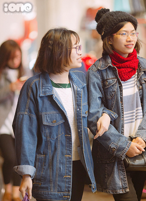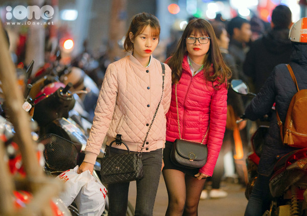 Các cô gái tấp nập đi mua đồ mặc Tết.