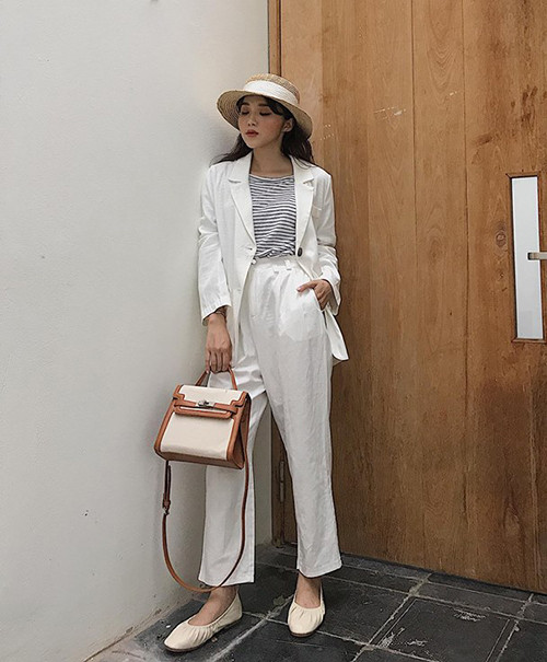 Nếu không muốn mình trông như một quý cô công sở nhàm chán, thay vì quần ôm, hãy kết hợp blazer dáng suông cùng những chiếc quần cạp cao ống rộng, độ dài chạm mắt cá chân.