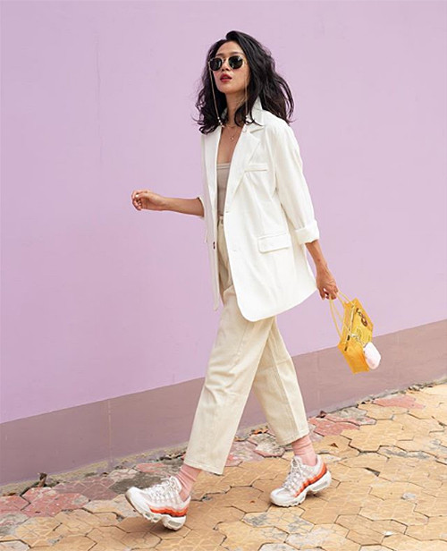 Để tăng độ trẻ trung cho set đồ, hãy bỏ qua các kiểu giày cao gót chông chênh. Thay vào đó, bạn nên diện suit cùng sneakers, boots hay các kiểu loafer.