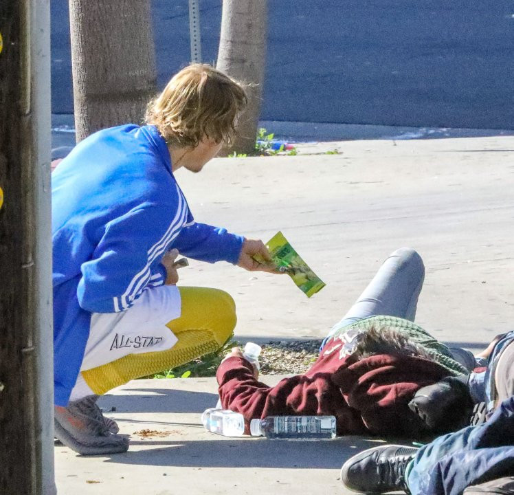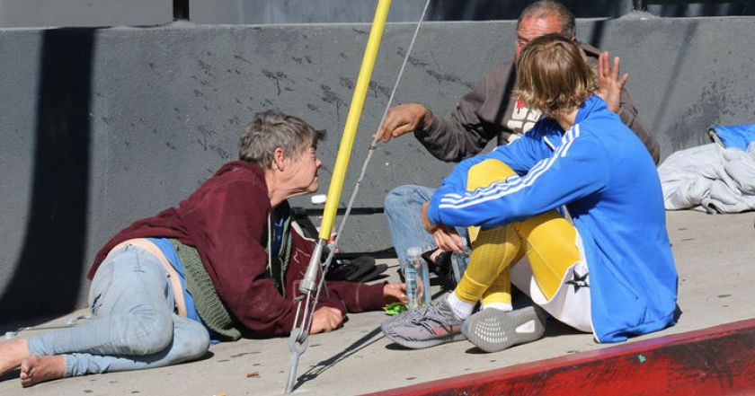 Đập bỏ rào cản của một ngôi sao, Justin Bieber vui vẻ ngồi xuống và trò chuyện với những người vô gia cư.