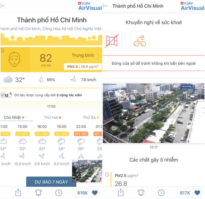 Air Visual là ứng dụng cho phép kiểm tra mức độ ô nhiễm không khí ngay trên điện thoại di dộng, cho cả iOS và Android. Ứng dụng này sẽ cung cấp thông tin về mức độ ô nhiễm tại các thành phố trên thế giới, trong đó có Hà Nội và TP.HCM, theo thời gian thực. Đồng thời cung cấp thông tin về tình trạng không khí tại các thời điểm trong ngày và các ngày trong tuần, từ đó cho phép người dùng sắp xếp chế độ sinh hoạt hay đi lại phù hợp.
