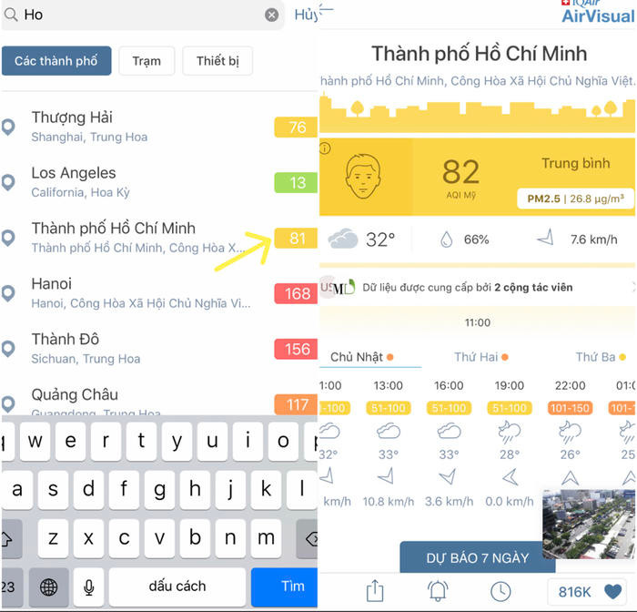 Bước 3: Gõ tên thành phố vào khung tìm kiếm, sau đó bấm vào các kết quả ở phía dưới để vào thành phố bạn muốn tìm hiểu. Ngay sau đó, các chỉ số AQI (chỉ số chất lượng không khí) sẽ hiển thị theo mốc giờ, kèm theo đó là các thông số như nhiệt độ, độ ẩm, sức gió… Đều sẽ được hiển thị để bạn tham khảo. Nếu muốn xem thời tiết của thành phố đó trong 7 ngày tới hãy bấm Dự báo 7 ngày.