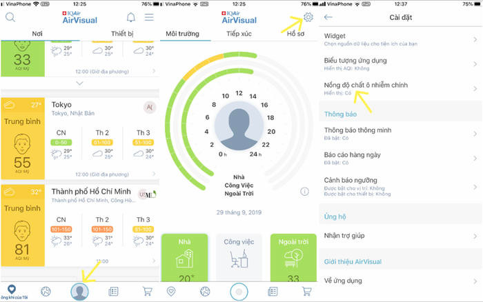 Nếu ứng dụng không thể hiện chỉ số PM 2.5 trên giao diện, bạn có thể kích hoạt bằng cách trở về giao diện chính > ấn vào biểu tượng con người ở cuối màn hình > chọn Cài đặt (biểu tượng răng cưa) > chọn hiển thị “Nồng độ chất ô nhiễm chính”.