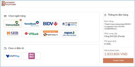 Tại màn hình Payment Platform, chọn Ngân hàng hoặc trung gian thanh toán, sau đó chọn "Thanh toán". Hệ thống sẽ điều hướng qua trang Internet Banking của Ngân hàng. Bạn đăng nhập tài khoản Ngân hàng để thực hiện thanh toán.