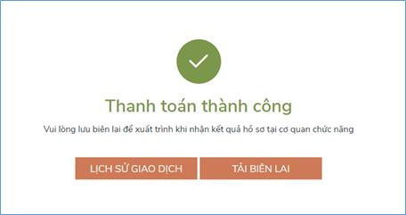 Khi thanh toán thành công, hệ thống sẽ điều hướng quay trở lại giao diện của Cổng DVC Quốc gia với thông báo "Thanh toán thành công".