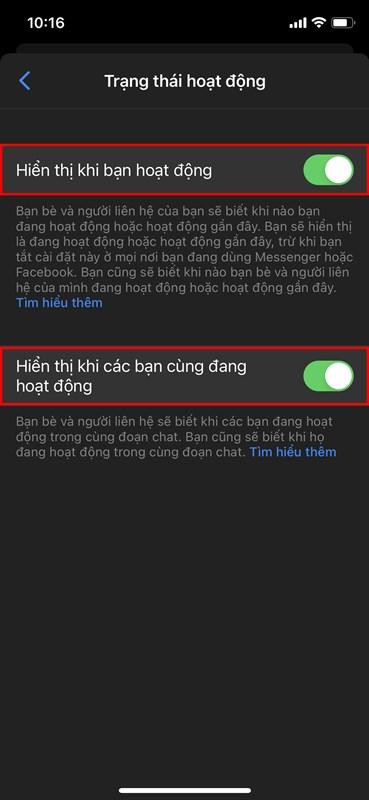 - Nếu bạn tắt trạng thái Hiển thị khi bạn hoạt động thì cài đặt Hiển thị khi các bạn cùng đang hoạt động cũng sẽ tự động tắt. Khi các cài đặt này tắt, sẽ không ai có thể biết bạn có đang hoạt động trong cùng đoạn chat hoặc đang trên Messenger hay không.