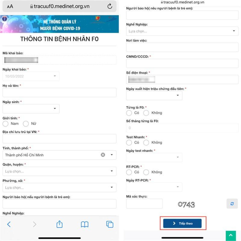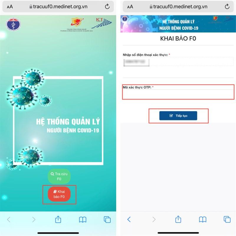 Bước 2: Khi có kết quả dương tính với virus SARS-CoV-2 (là đối tượng diện F0) thì bạn sẽ chủ động khai báo thông tin tại đây. Sau đó, bạn nhấn mục Khai báo F0 và thực hiện xác thực số điện thoại của bạn.