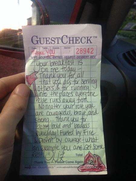 Cảm động trước tình cảm này, hai người lính cứu hỏa đã đăng hình ảnh về đoạn viết của Liz, cùng trải nghiệm về thức ăn ở Route 130 Diner - Delran, nơi Liz làm việc phục vụ lên trang cá nhân. Paul và Tim khuyến khích mọi người hãy đến quán ăn và ủng hộ cho Liz.