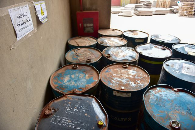 Theo một lãnh đạo công ty cho biết, nhà máy dùng nhiều loại máy sử dụng dầu nên cứ 6 tháng lại thải ra một lượng dầu thải lớn. Sau khi dầu thải được thay, một số lượng nhỏ dùng tiếp cho các máy thiết bị nhỏ hơn, phần còn lại được đống vào phuy chứa giao cho phòng vật tư chờ xử lý.