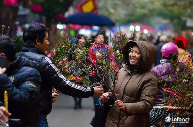 Giá mỗi cành đào ở chợ hoa Hàng Lược dao động từ khoảng 100.000 đồng đến 300.000 đồng.