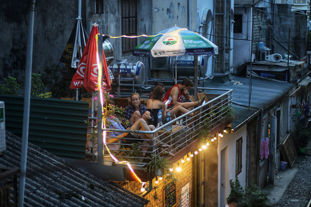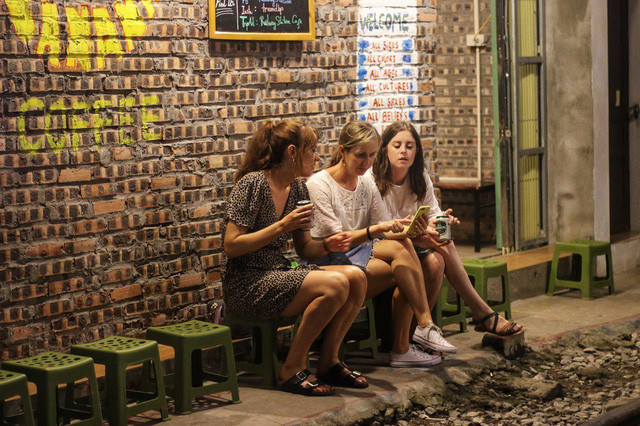 Những du khách nước ngoài ngồi đợi chuyến tàu tối lúc 19h tại một quán cà phê nhỏ ở xóm đường tàu.