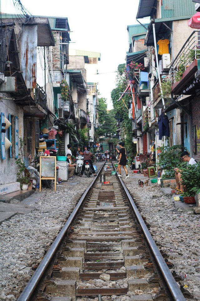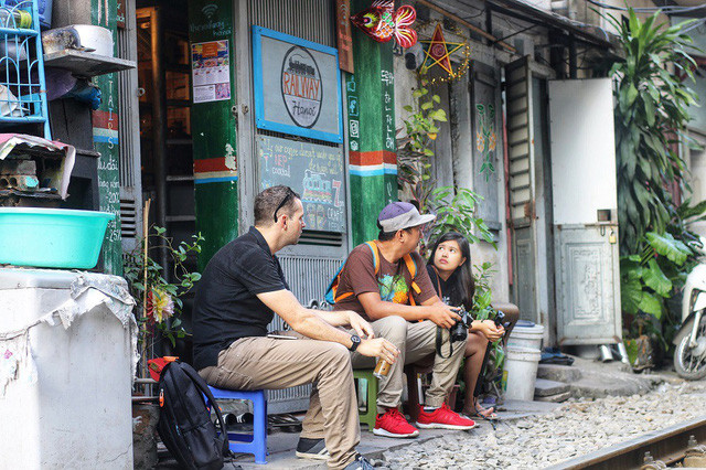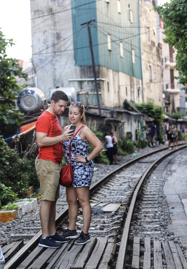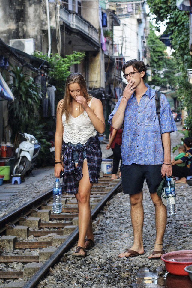 Du khách nước ngoài rất tò mò khám phá nhịp sống bên đường tàu của người dân nơi đây