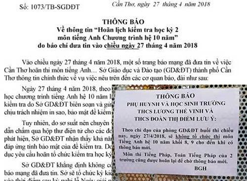 Thông báo của Sở GD-ĐT Cần Thơ về sự cố lộ đáp án kiểm tra môn Anh Văn.