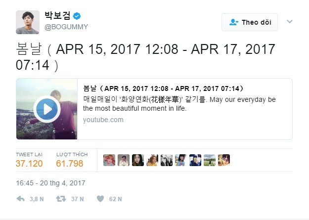 Mới đây, nam diễn viên Park Bo Gum đã chia sẻ một clip ghi lại cảnh anh và V (BTS) "du hí" tại đảo Jeju (Hàn Quốc). Trước đó, V đã đăng những bức ảnh đẹp khiến fangirl xao xuyến về chuyến đi chơi riêng của hai người. Một fan đã bình luận dưới các bức ảnh: "Chắc hai anh lập kế hoạch với nhau, người đăng ảnh, người chia sẻ clip cho dân tình tha hồ "GATO" đây mà!".