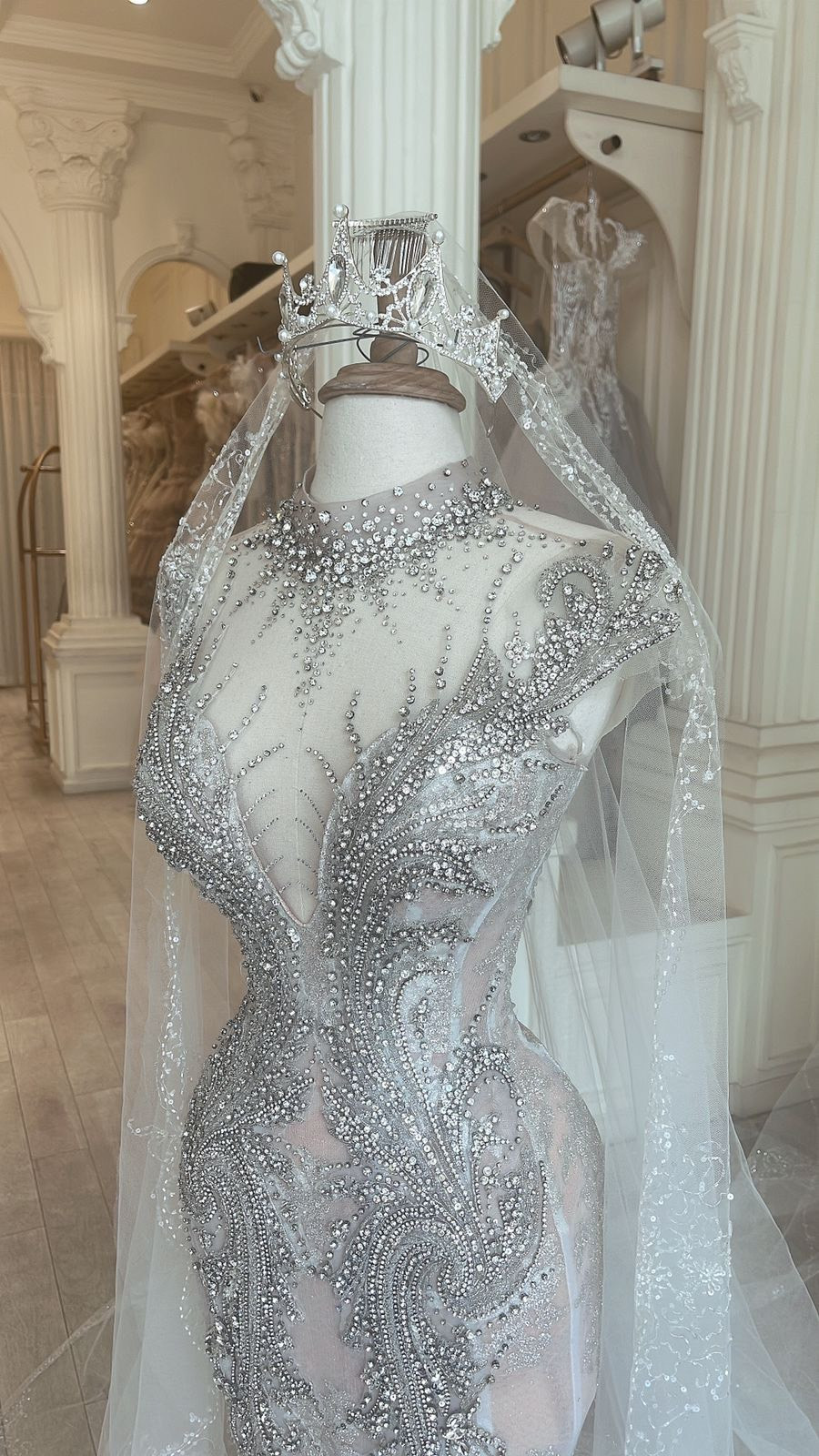 Chiếc váy được thiết kế cầu kỳ, cùng điểm nhấn là phần đá đính kết ở cổ, hai bên vai chạy dọc thân váy tôn lên vóc dáng thanh thoát của cô dâu.