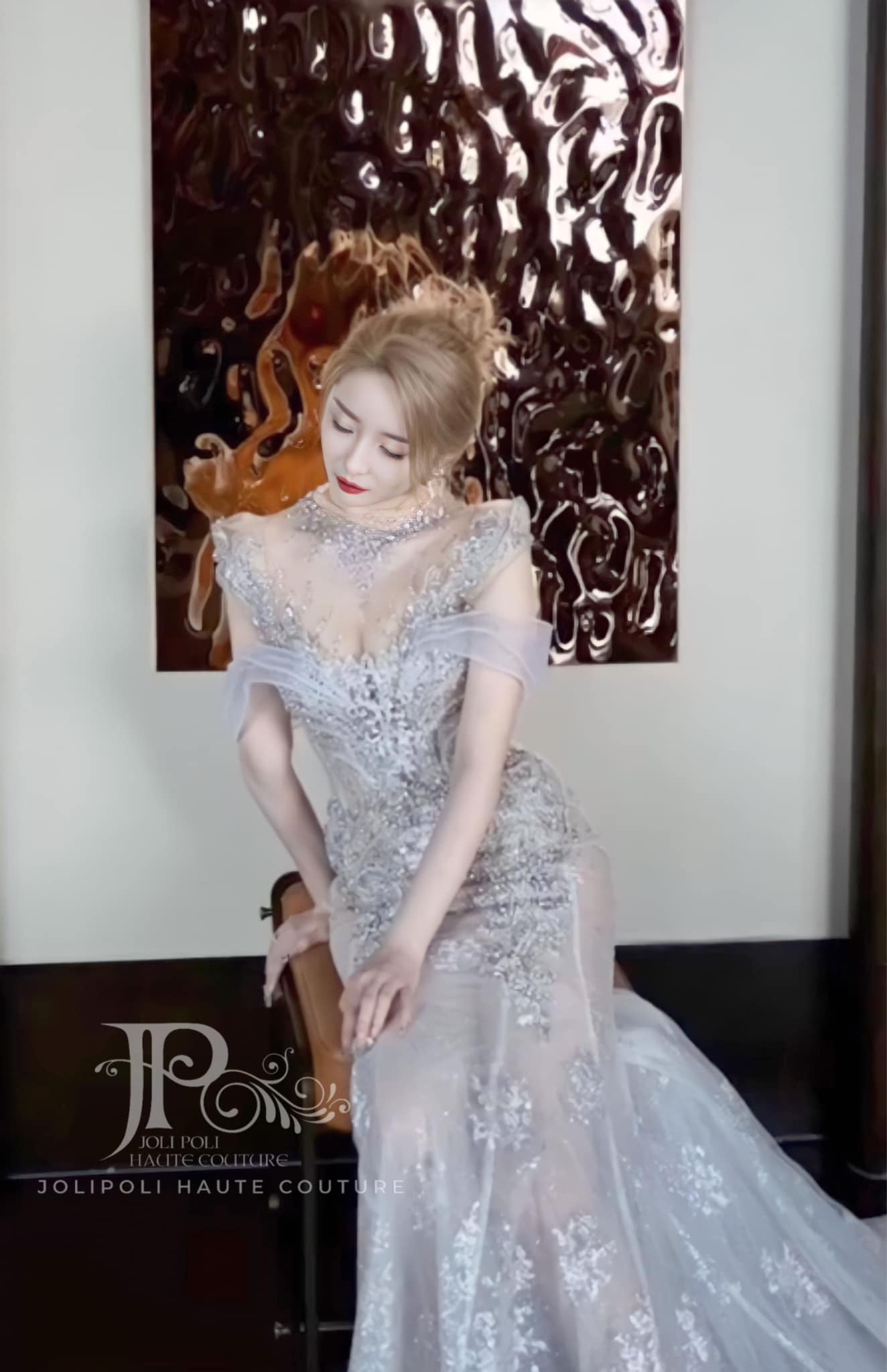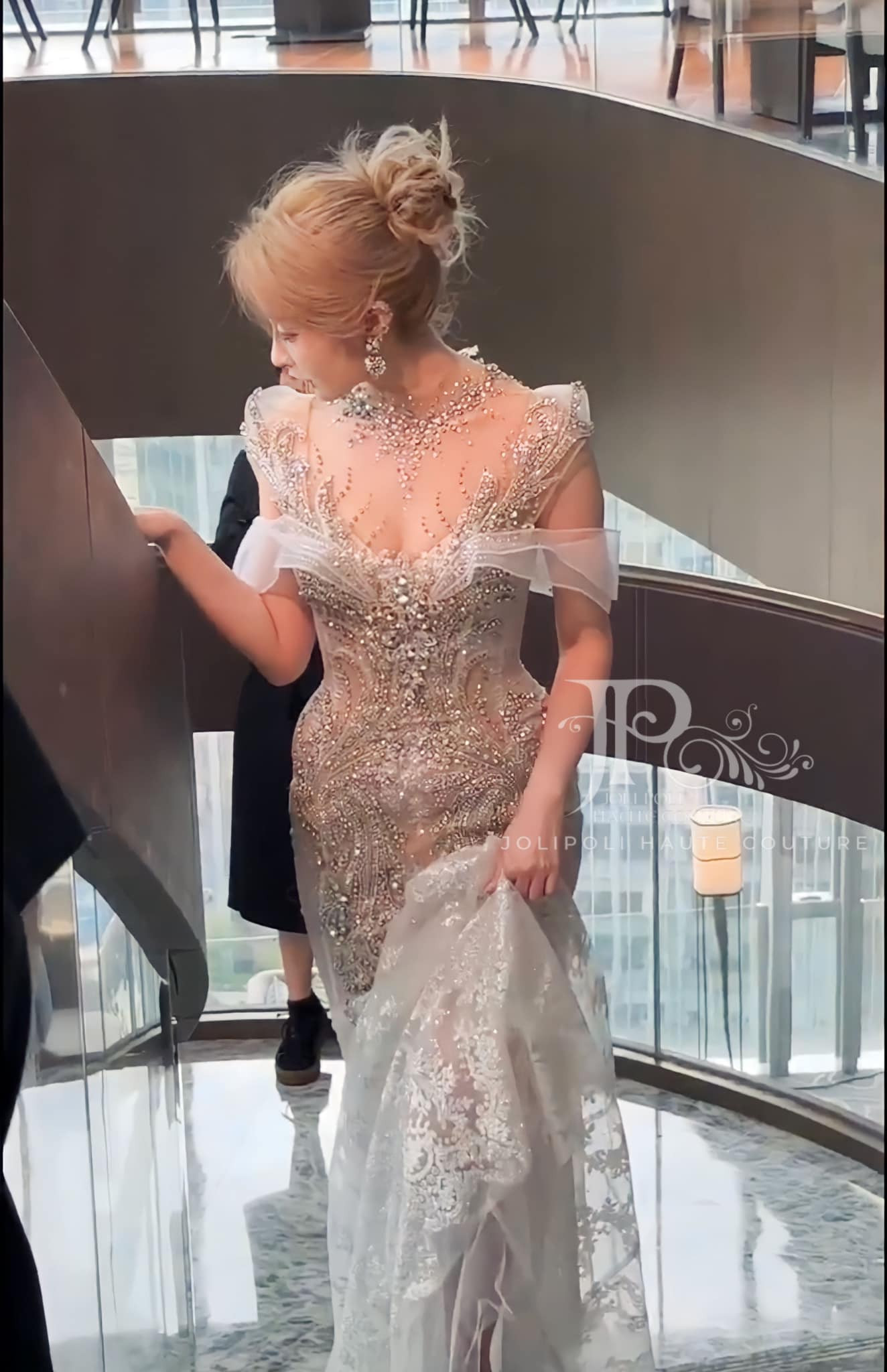 Xuất hiện trong ngày trọng đại, cô dâu Khang Khang gây chú ý với chiếc váy cưới đuôi cá màu bạc lấp lánh. Đáng chú ý, thiết kế này đến từ thương hiệu Joli Poli của NTK Việt Nam - Phạm Đăng Anh Thư với mức giá 250 triệu đồng.