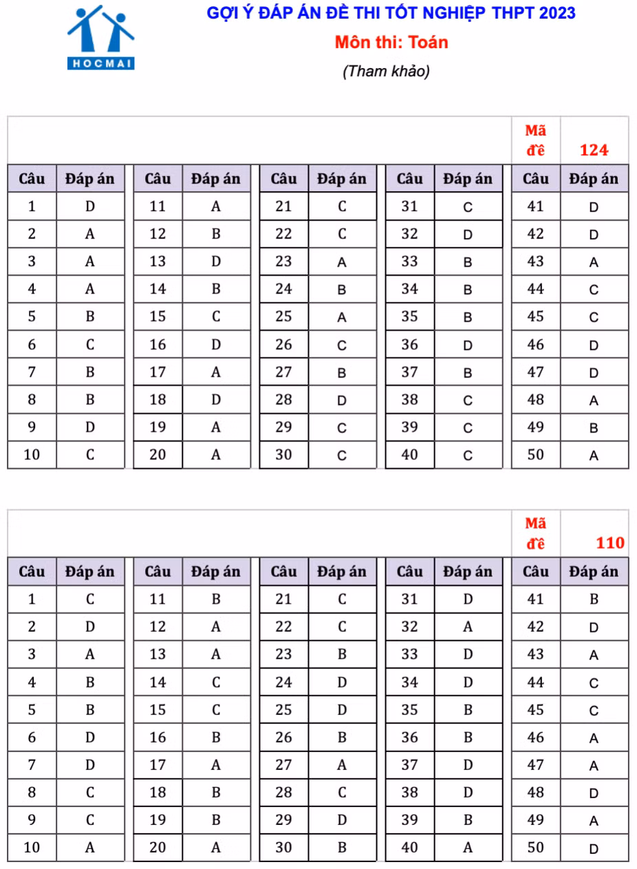 Dưới đây là đáp án môn Toán do tuyensinh247, Hệ thống giáo dục HOCMAI thực hiện, mời thí sinh tham khảo: