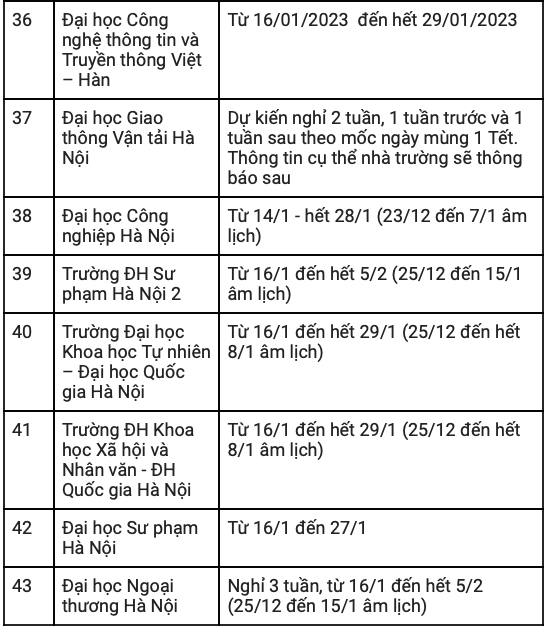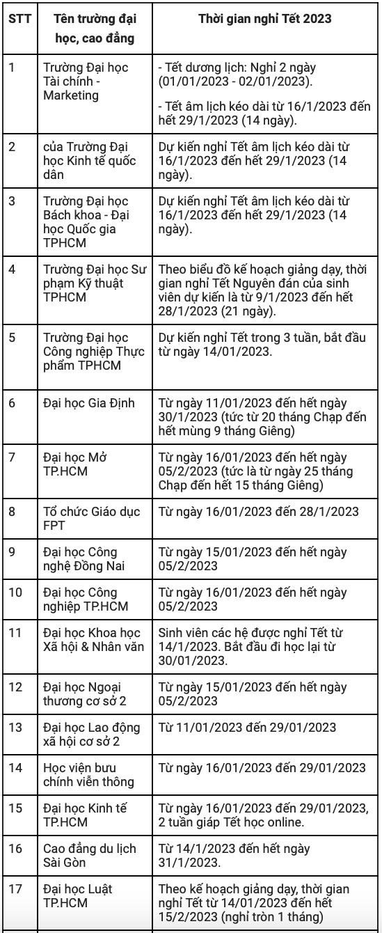 Dưới đây là bảng cập nhật lịch nghỉ Tết Nguyên đán 2023 của sinh viên các trường Đại học, Cao đẳng:
