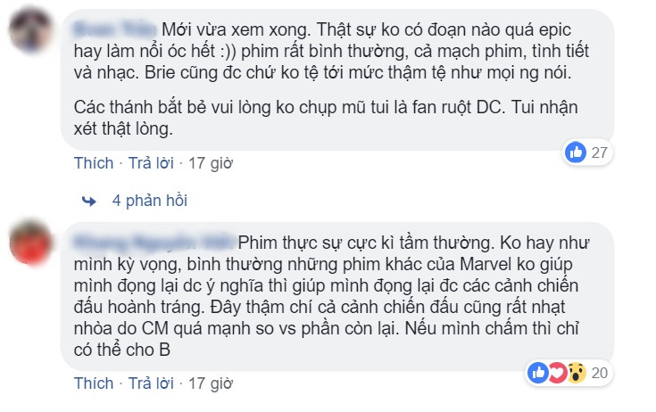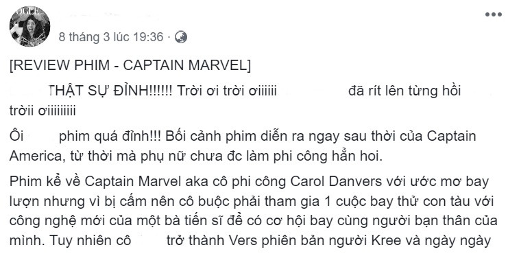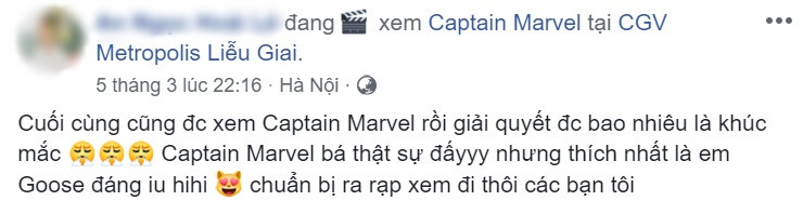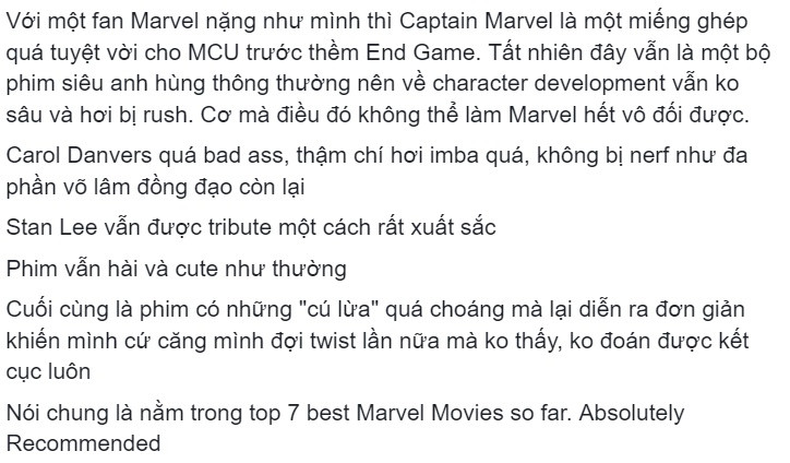 Nhiều người khẳng định Captain Marvel là một "bom tấn" mãn nhãn, hoành tráng và hài hước. Phim có một "cú lừa" ngoạn mục khiến fan không thể đoán được cái kết. Đặc biệt, Captain Marvel với sức mạnh vượt trội là hình tượng mẫu mực cho các nữ anh hùng. Những lần "Chị Đại" phô diễn sức mạnh đều khiến khán giả phải đứng ngồi không yên.