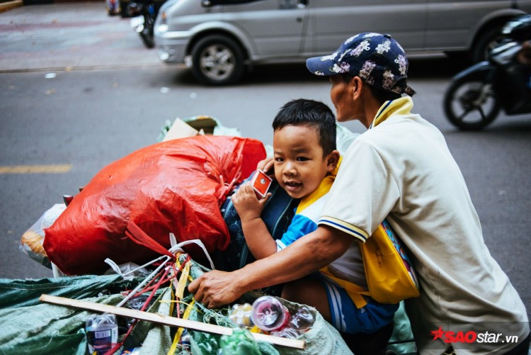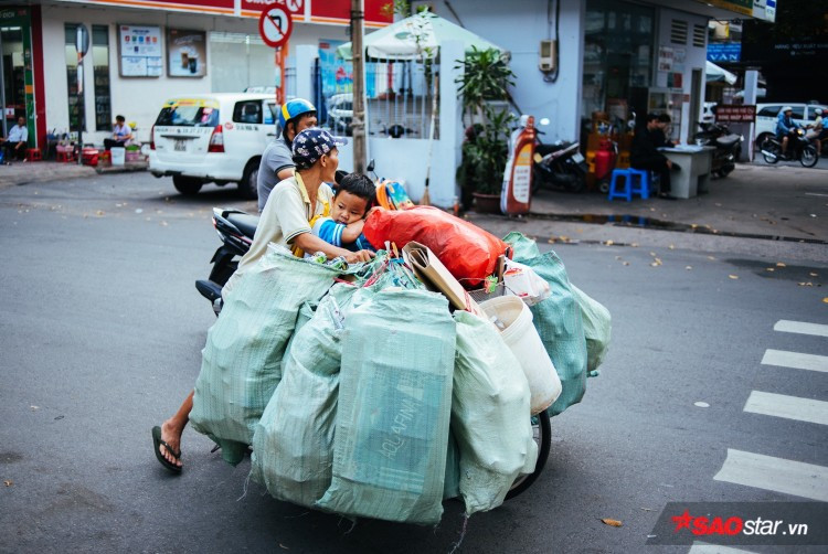 Chiếc xe tòn ten đống chai nhựa cao quá đầu, mẹ Thịnh không chống chân tới, thằng bé phải ra sức đẩy phụ. Cứ thế, con nằm trên đống giấy, mẹ ngồi yên sau, đẩy từng bước.