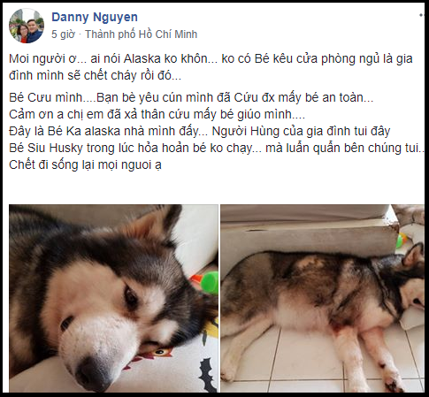 ”Moi người ơi… ai nói Alaska không khôn? Không có Bé kêu cửa phòng ngủ là gia đình mình sẽ chết cháy rồi đó. Bé cứu mình, sau đó bạn bè yêu cún đã cứu mấy bé an toàn. Cảm ơn anh chị em đã xả thân cứu mấy bé giúp mình. Đây là bé Ka Alaska nhà mình đấy, người hùng của cả gia đình tôi. Bé Siu Husky trong lúc hỏa hoạn đã không chạy, mà luẩn quẩn bên chúng tôi. Đúng là chết đi sống lại mọi người ạ”.