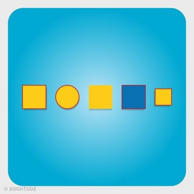 Chúng ta sẽ chọn hình khác biệt nhất trong số này, và thường thì sẽ hướng đến hình vuông màu xanh. Nhưng nếu để ý, thì các hình còn lại cũng có những điểm đặc biệt. Như hình 2 là hình tròn duy nhất, hình 3 là hình vuông duy nhất không có viền, và hình 5 là hình vuông duy nhất có size nhỏ.