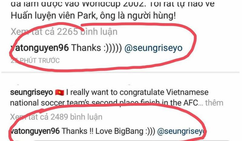 Cách đây không lâu, khi đội tuyển U23 giành những chiến thắng vang dội tại AFC 2018, chính Seungri đã gửi lời chúc mừng đến đội tuyển U23 Việt Nam trên Instagram. Văn Toàn nhanh chóng vào cảm ơn và hồi đáp "Love BigBang".