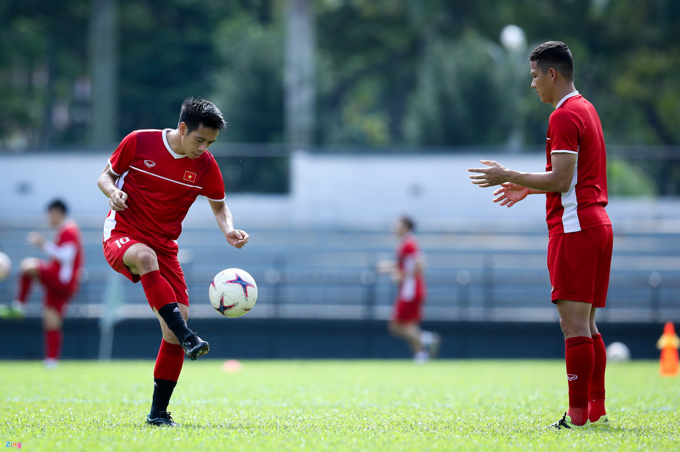 Văn Quyết và Anh Đức tập cùng nhau. Họ là những cầu thủ kỳ cựu bậc nhất, nhiều kinh nghiệm nhất ở đội tuyển Việt Nam.