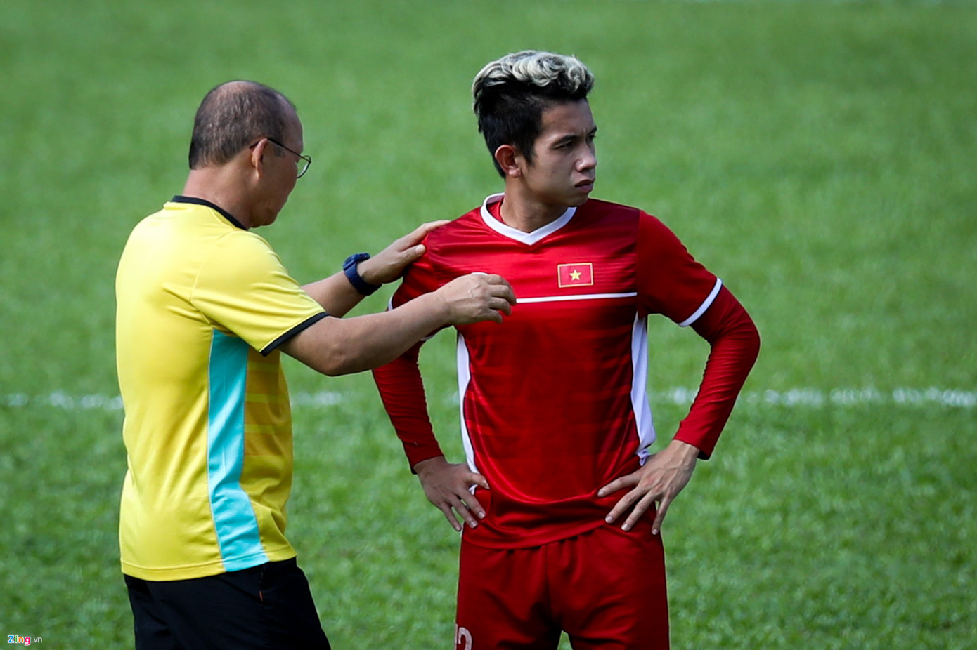 Thầy Park trao đổi riêng với Hồng Duy trước phần tập chiến thuật. Tiền vệ của HAGL là cầu thủ dự bị quan trọng nhờ tốc độ và khả năng tạo đột biến ở biên trái.