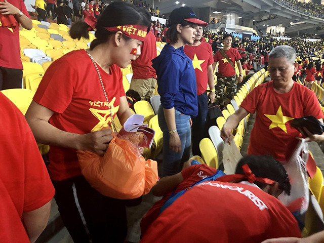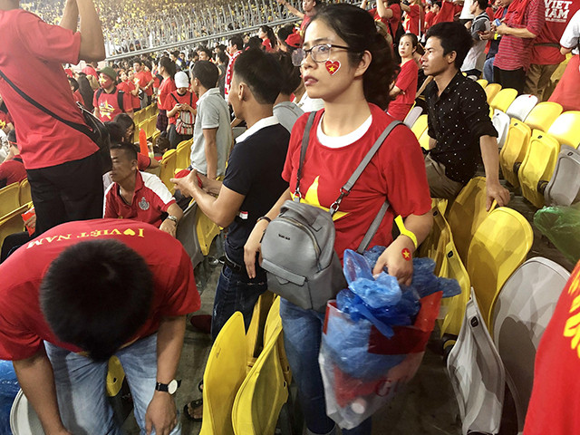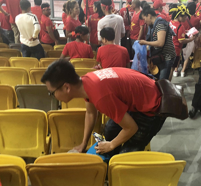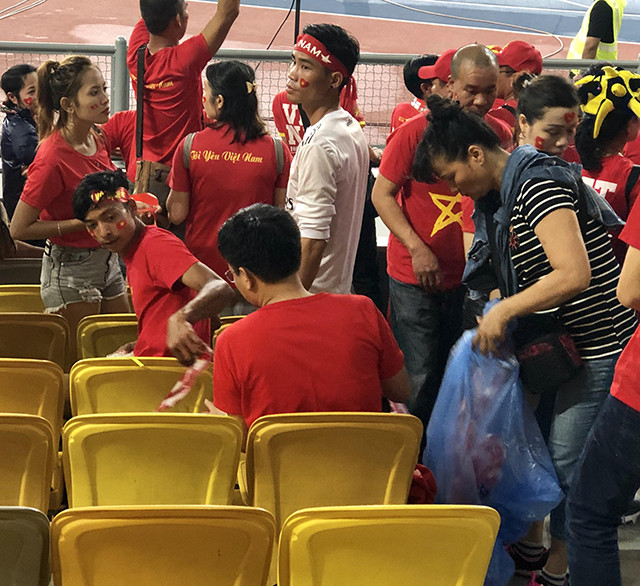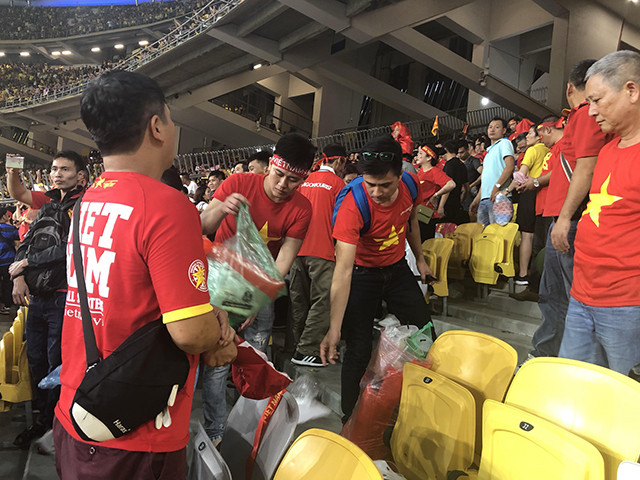 Kết thúc trận hòa 2-2 trước Malaysia, dù đã 23h đêm (giờ địa phương) nhưng các CĐV Việt Nam vẫn bảo nhau cùng ở lại nhặt sạch rác trên khán đài trước khi trước rời sân vận động. Hành động đẹp này để lại nhiều ấn tượng tốt trong lòng người dân nước bạn.
