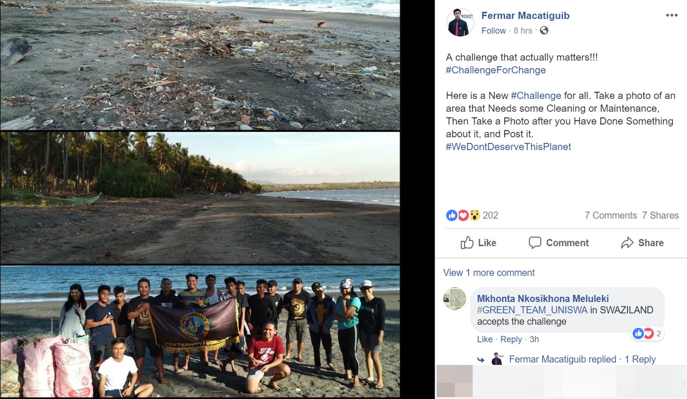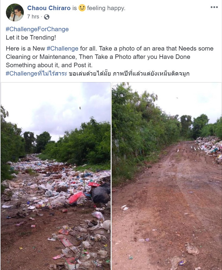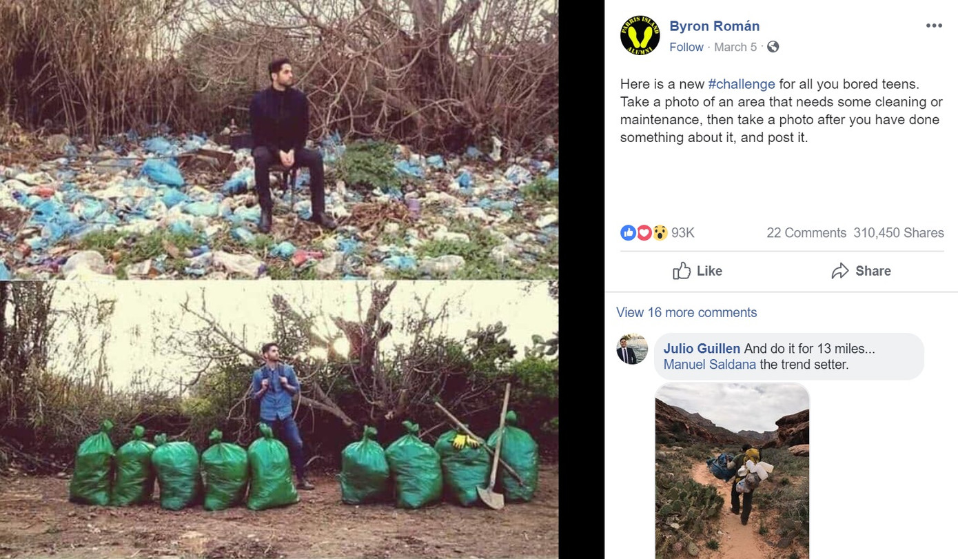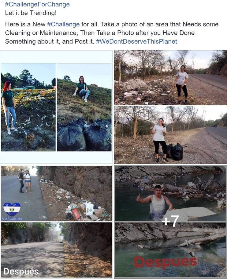 Vừa qua, một tài khoan Facebook có tên Byron Román đã đăng tải 2 bức ảnh, cùng một địa điểm nhưng một bức ngổn ngang rác khắp nơi, bức còn lại là hình ảnh rác đã được dọn sạch. Ngay trong chính bài đăng đó, Byron Román đã chia sẻ như sau: "Đây là một thử thách mới dành cho các bạn teen đang cảm thấy chán. Chụp ảnh một khu vực cần được dọn dẹp hoặc sữa chữa, sau đó chụp một bức ảnh mới khi khu vực ấy đã được dọn sạch rồi post nó lên nhé!"