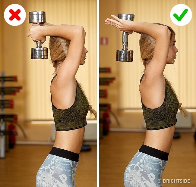 Tư thế đúng: Cầm quả tạ bằng cả hai tay với lòng bàn tay hướng lên trên như hình. Giữ vai bất động, khép khuỷu tay càng sát với đầu càng tốt. Nâng tạ lên cao quá đầu rồi từ từ hạ thấp.