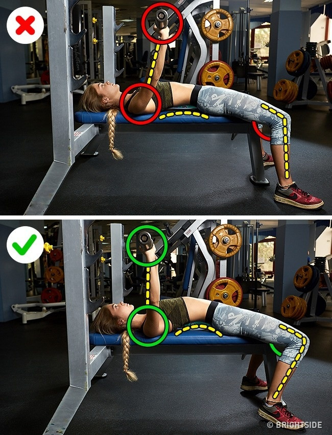 Tư thế sai: Bạn cầm tạ ở giữa phần tay cầm của tạ, việc này không có tác dụng tạo cơ bắp, mà sẽ đổ hết mọi “gánh nặng” lên các khớp.