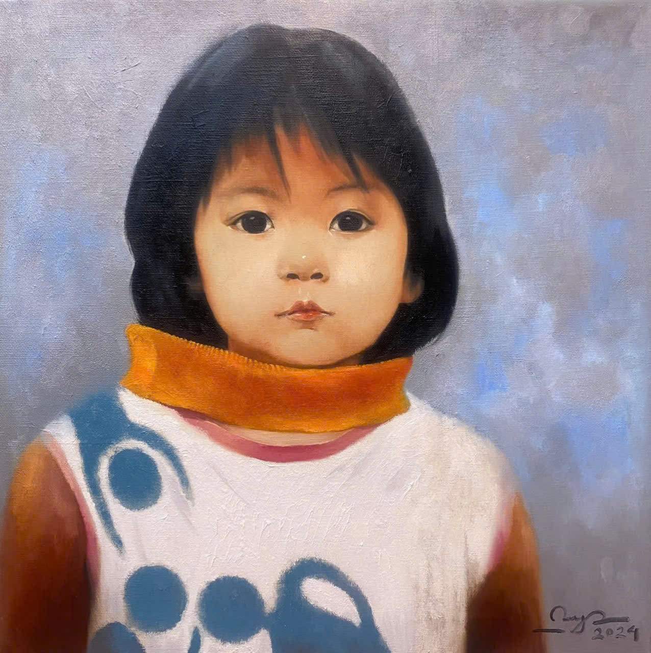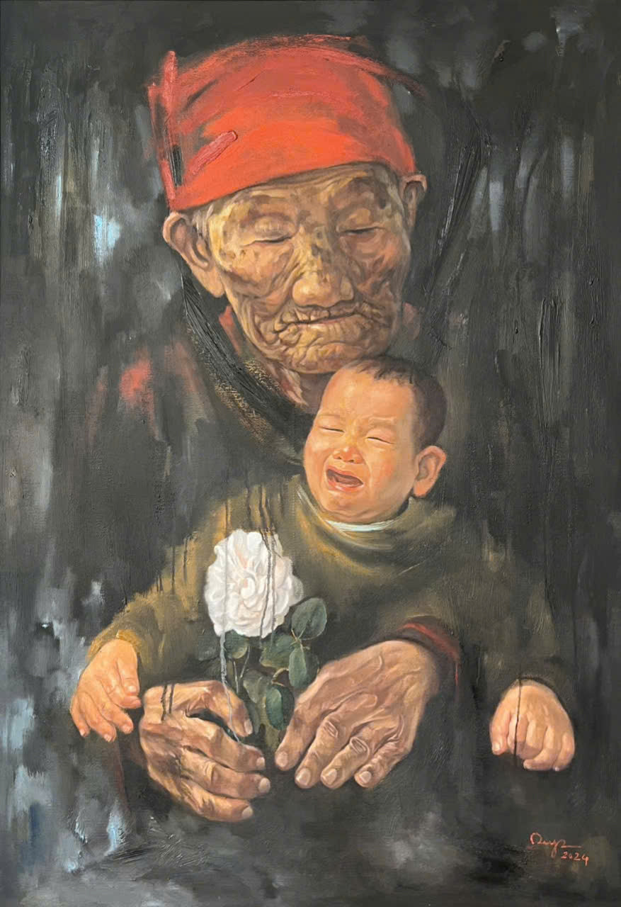 Điểm nhấn trong triển lãm là loạt chân dung hiện thực khổ lớn. Bà Nội tôi được tác giả duy trì vẽ liên tục từ năm cụ 97 tuổi đến khi cụ 101 tuổi và quy tiên (2024).