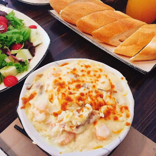 Tôm bỏ lò phomai được ăn kèm với bánh mỳ. Bánh mỳ chấm với sốt kem béo ngậy sẽ ngon tuyệt. Bữa ăn của bạn sẽ đầy đủ rất dinh dưỡng và đảm bảo là no lâu cực kỳ luôn.